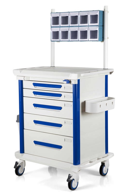 ABS Plastik gövde Şeffaf kapaklı malzeme kutuları Merkezi kilitli, bölmeli çekmece sistemi (1 büyük, 2 orta, 2 küçük) Disposable iğne toplama kutusu Açılabilir ilaç hazırlama sehpası 4’lü tekerlek ter